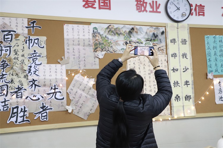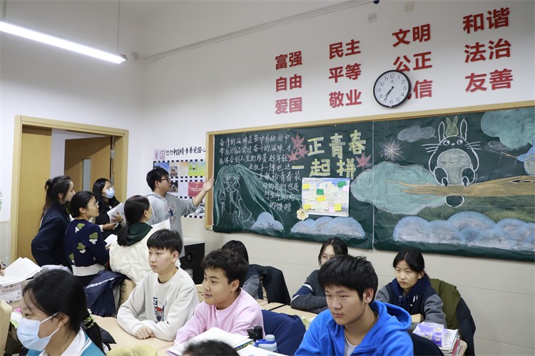 此次班级文化建设评比活动聚焦班级文化布置、文化活动、文化制度和亮点分享等几大板块,解说员结合班级文化的陈设,将班级风貌、班规、班训、班歌、小组建设成果等向评委们进行充分展示。
