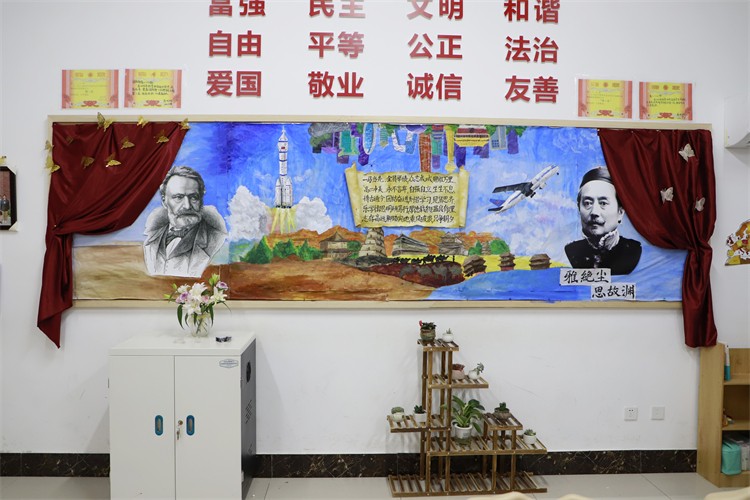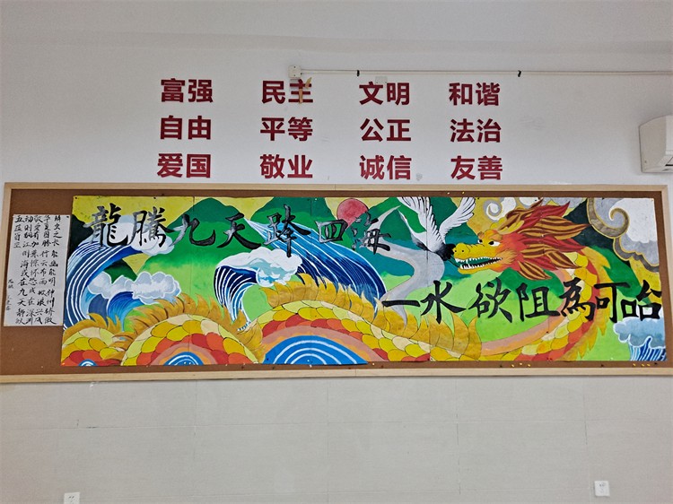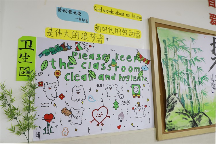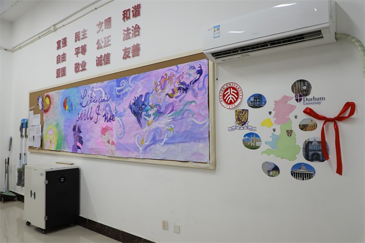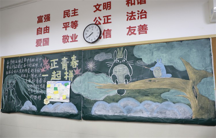 别具一格的设计彰显着同学们的匠心,令人眼花缭乱的布置堆叠着无数巧思。走进高一二班,首先被满满的绿植抓住眼球,似乎置身热带雨林,仰首观望,漂浮的云彩和热气球又让评委们似乎来到了梦幻国度,两种迥然风格的大胆碰撞给人以极大的冲击感。高一A-Level班五彩斑斓的小马宝莉板报配合着极富力量感的主题标语,反差感十足。高二五班风格简单鲜明,一幅巨大的书法作品“道阻且崎,行则将至”道出了坚守恒心、踏实认真的班级风气。“龙腾九天跨四海,一水欲阻为可咍。”高三二班的板报主要由长龙、仙鹤、海和山构成,宝贵的高中生活只剩下最后不到的一年时光,同学们用仙鹤表达对离别的不舍,龙作为华夏图腾,出海入云,寄寓着同学们对光明未来的期望,他们期望在毕业后奔赴山海,顶峰相见。