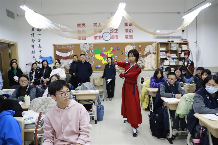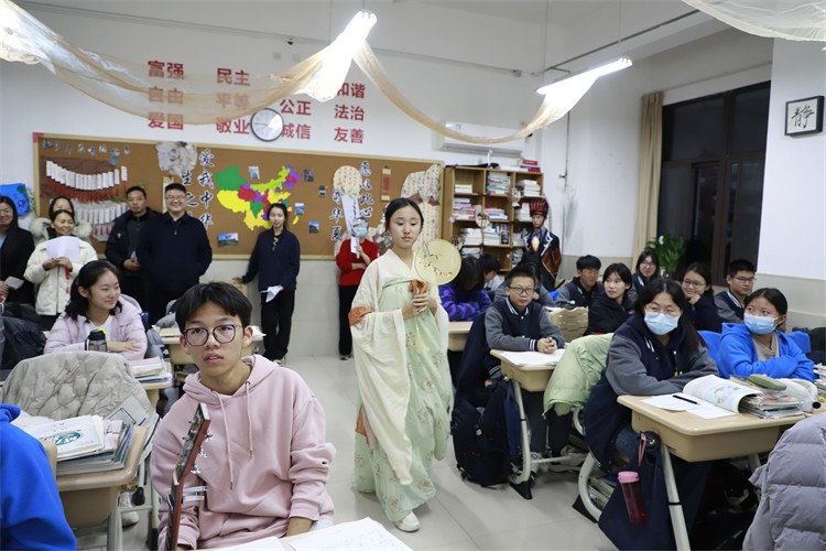 为了更好地呈现班级文化建设成果,渲染班级文化气息,各班级在讲解展示环节也都充分开动脑筋。有不少奇思妙想。高一三班展示了中德智能制造实验课程上学习的“小车碰撞”游戏,既体现了作为中德职能制造班的亮点与特色,也体现了他们对科学实践的钻研探究精神。为“读好中国”,高一四班的同学们贴上了广博的中国疆域,贴上了精深的中国典籍,贴上了美轮美奂的中国绘画,古色古香的班级布置再加上身着古装或舞蹈或舞剑或行礼的同学们,评委们仿若穿梭千年,回到了那悠远而神秘的古中国。高二一班窗帘上镌刻着书法作品,板报上绘制了古今丝绸之路,穿越时间与空间的阻隔,雨果和辜鸿铭两位学通古今、博览世界的大学者隔空对话。班级文化展示模拟成“游戏副本”的形式,跟随着讲解员的步伐,评委老师们沉浸式参观体验了丝绸之路的古今,看到了同学们“以史为鉴”形成的“共生共荣、共享共融”的班级文化精神,看到了焦点娱乐学子非同一般的家国情怀与责任担当。高二三班合唱班歌,流畅的发音离不开他们对德语学习的坚持和努力,由弱渐起、越发嘹亮的歌声彰显了他们自信昂扬、积极阳光的精神风貌。