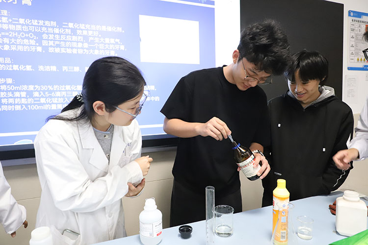 观演者的座位,逐渐容不下被点燃的参与感。互动环节,学生从“旁观者”变身“实践者”。“硫氰化铁检验”实验中,当自己的滴管让溶液绽开血红色时,课本上的离子方程式完成了从符号到实感的“惊险一跃”。“过饱和醋酸钠结晶”则更具诗意——玻璃棒轻触,晶体如白色藤蔓瞬间疯长,攀满整个器皿。压轴戏属于“大象牙膏”。当学生亲手将催化剂注入高浓度过氧化氢,黄白色的泡沫巨浪轰然喷发,膨胀、攀升,最终凝固成一座小小的、嘶鸣着的泡沫山丘。惊呼与掌声炸响,这不是破坏,而是一次关于分解、气体与能量的可控的轰鸣,是规律被验证时最直接的欢愉。