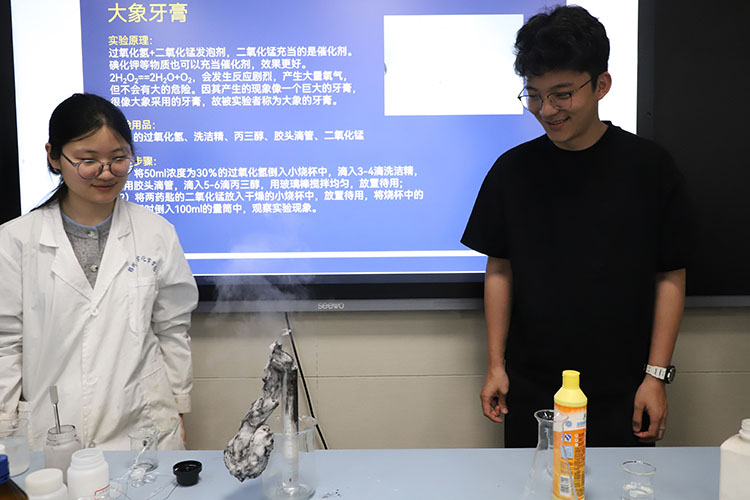同学们上台操作“大象牙膏”实验