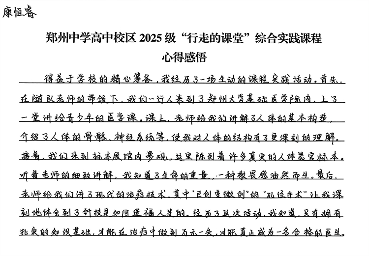 郑州高新区法院的模拟法庭上,学生化身法官、律师,在“陈述-举证-辩论”中沉浸式体验法律程序的庄严与正义;郑州大学文学院的诗词解码与省美术馆的中国画展里,笔墨技法与中华文化的交融,让“文化自信”从概念变为可感的美学体验。郑大体育学院的实验室里,运动模式与营养补充的科学规律被拆解;乒乓球训练馆的高水平对抗中,“持之以恒”的体育精神比奖牌更动人——当“强健体格”与“运动科学”双重视角打开,体育的价值早已超越胜负。